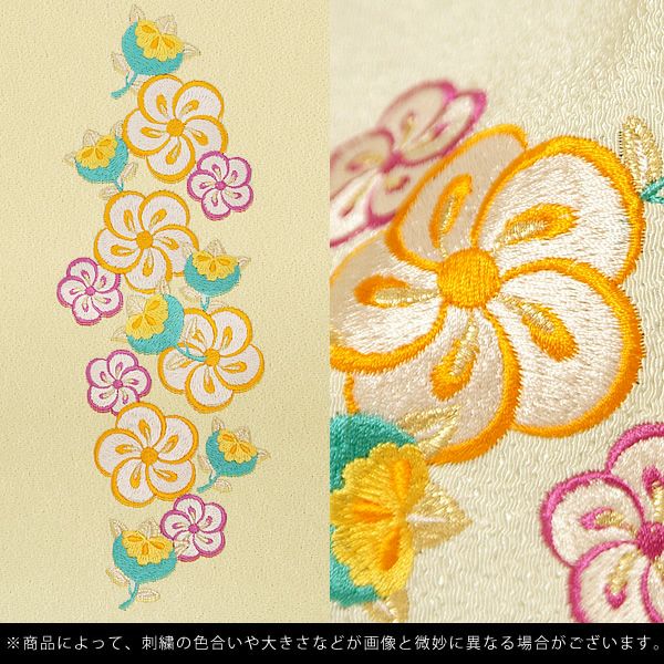 【カラー】柔らかな生成りみの白色地に、橘、捻じ梅の刺繍模様。丸みのある模様が可愛らしい華やかな雰囲気。