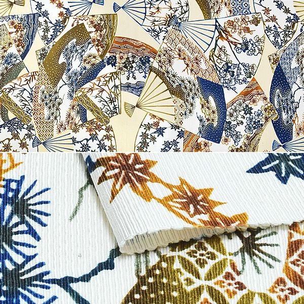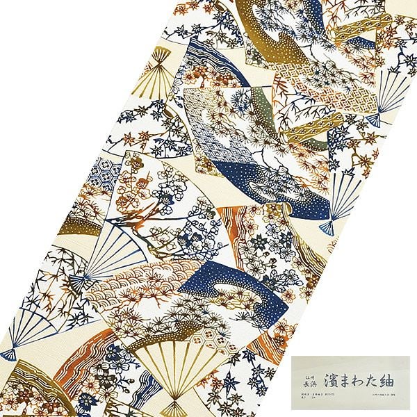 柔らかな淡いクリーム地に、扇子、地紙尽し模様。