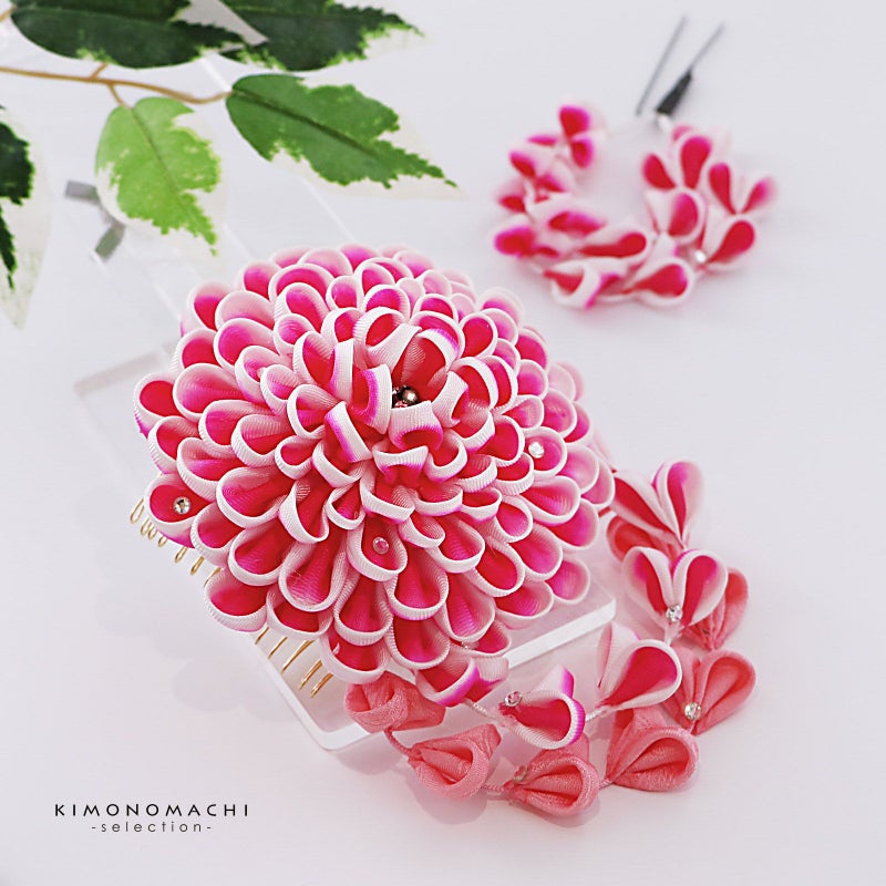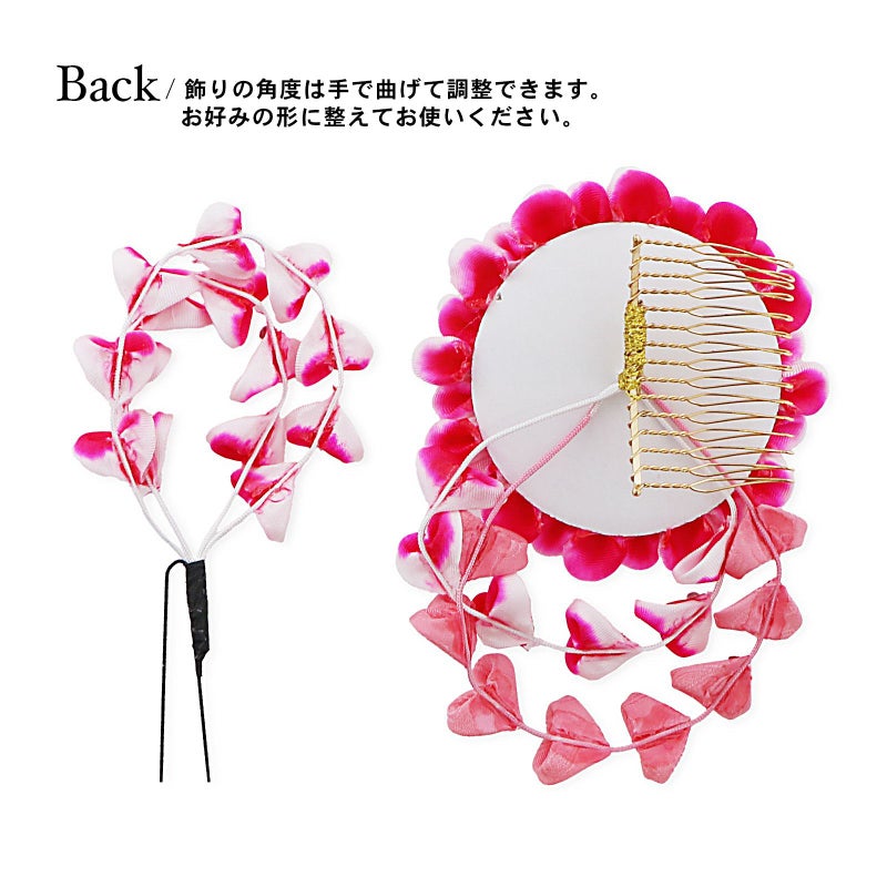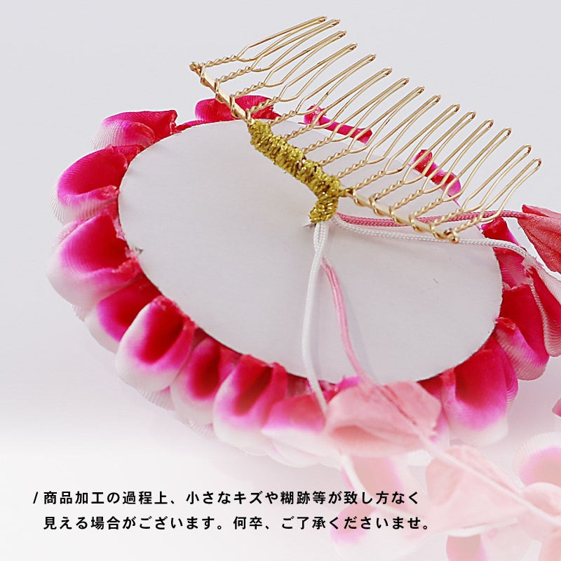 【カラー】コームは、赤ピンクぼかしの細かなつまみのお花。浅いピンク、ピンクぼかしのつまみを輪にした飾りがついています。Uピンは、赤ピンクぼかしのつまみの輪。