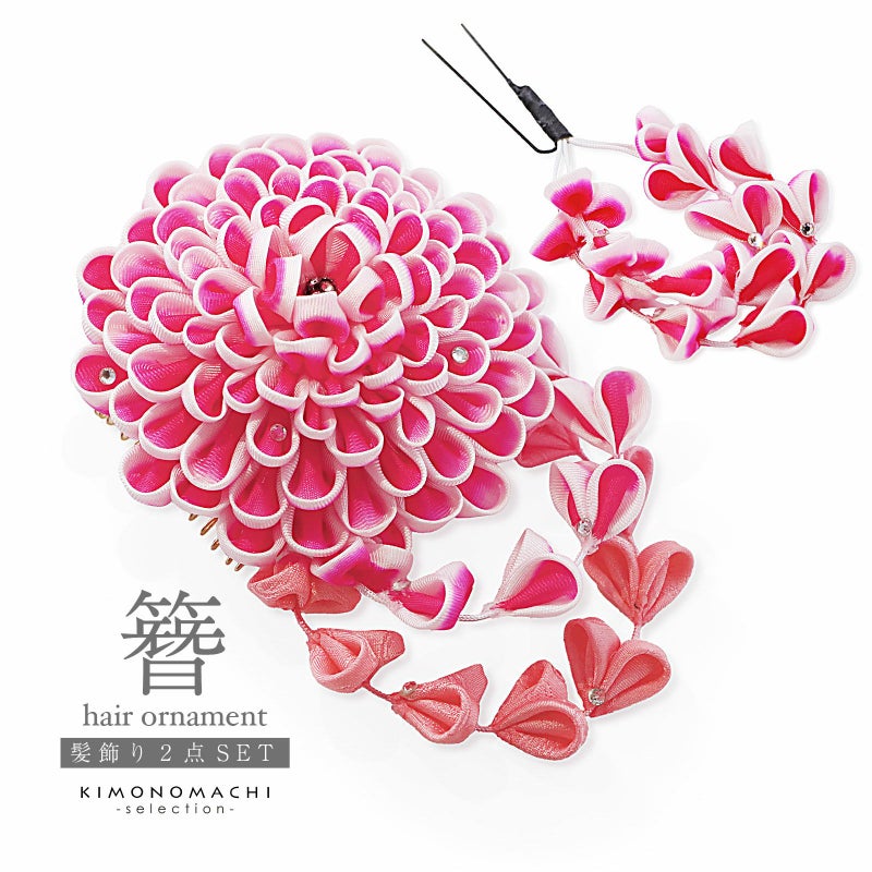 つまみ細工のお花の華やかな髪飾り2点セットです。振袖などの華やかなお着物に合わせて、成人式、結婚式などの晴れやかな席に。卒業式の袴に。