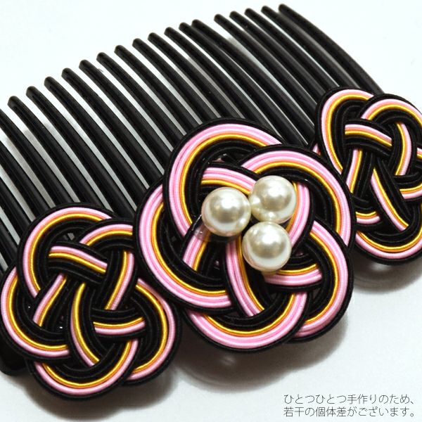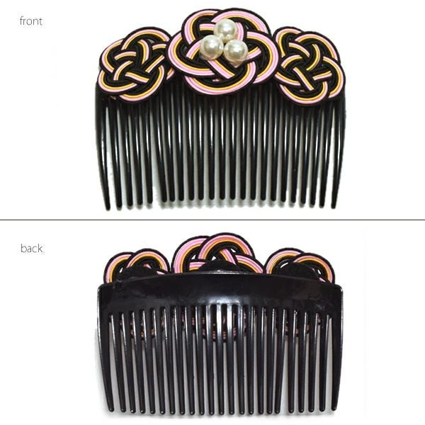 【カラー】ピンク、黄色、黒色の色使いの水引きのお花。コームは黒色。