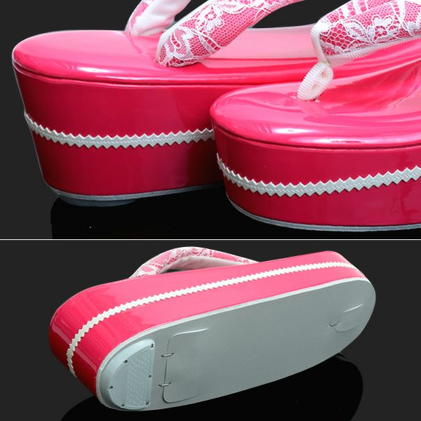 【カラー】草履の台は、こっくりとした濃いピンク色。巻き部分には白色のジグザグ模様。鼻緒は白色のお花模様のレースを被せています。
