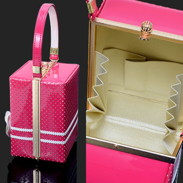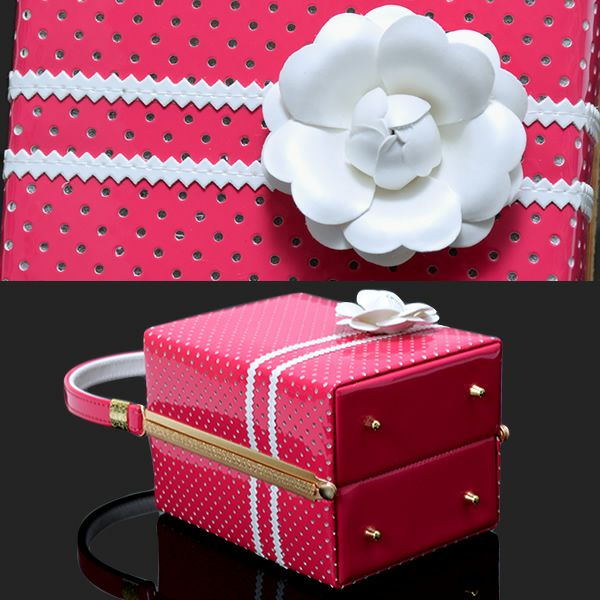 【カラー】バッグの表裏はこっくりとした濃いピンク色、ドットのカッティング模様。上、側面、持ち手はこっくりとした濃いピンク色。白色のお花飾り。