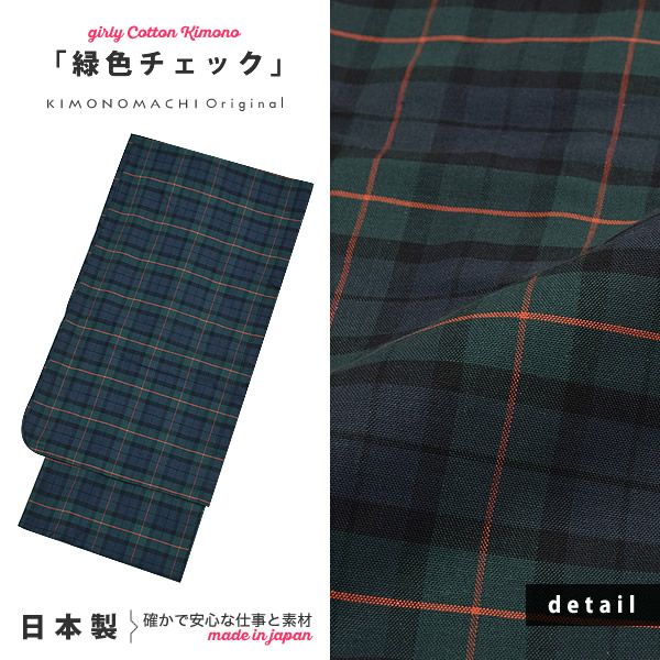【カラー】グリーン、暗い浅めのネイビーに、朱赤色のチェック模様。