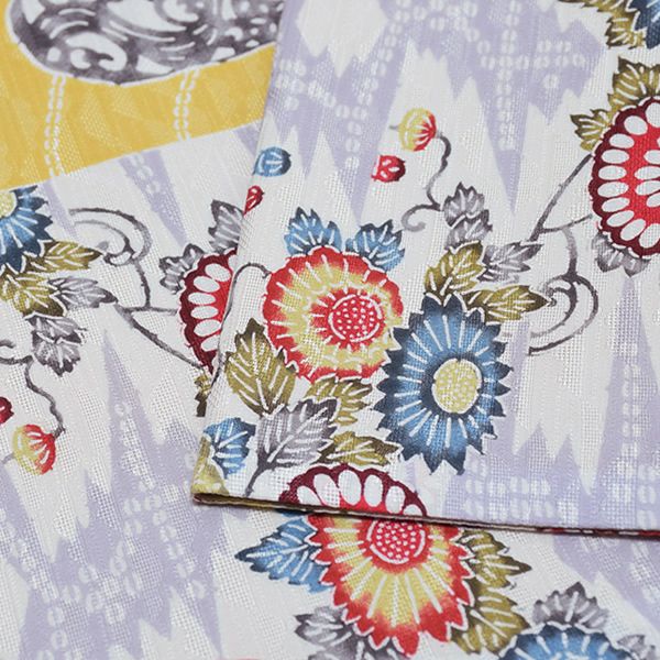 薄い黄色にグレーの色使いの丸に流水、花模様。