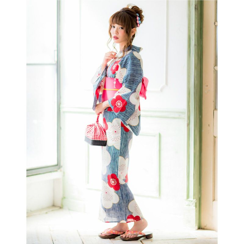 浴衣 単品 レディース 「紺色 変わり縞に梅」 女性浴衣単品 フリーサイズ 綿浴衣 花火大会 夏祭り 女性ゆかた 【メール便不可】