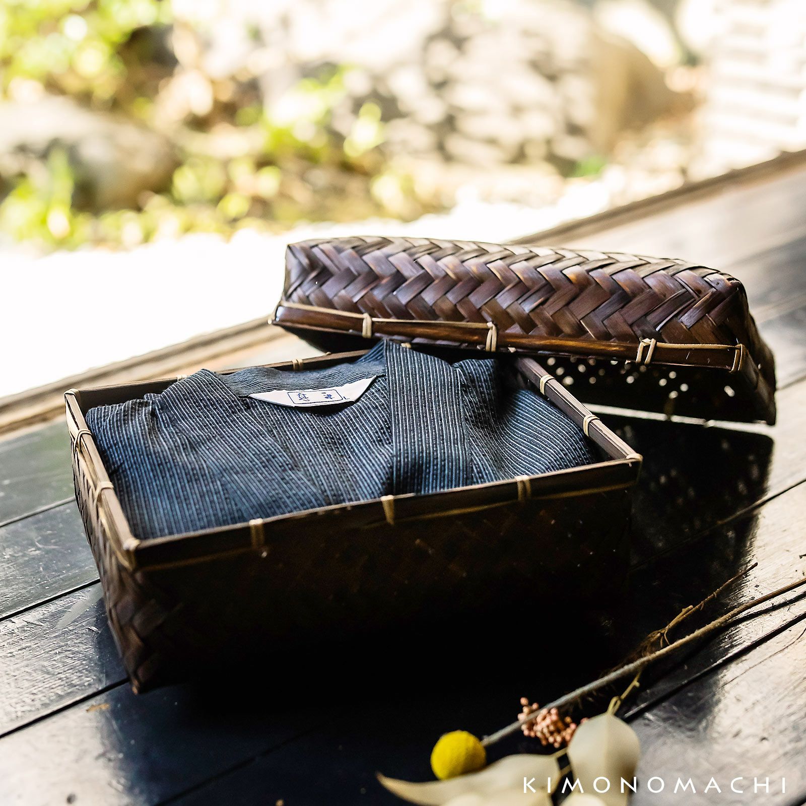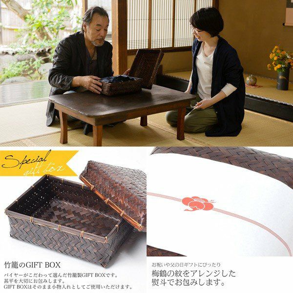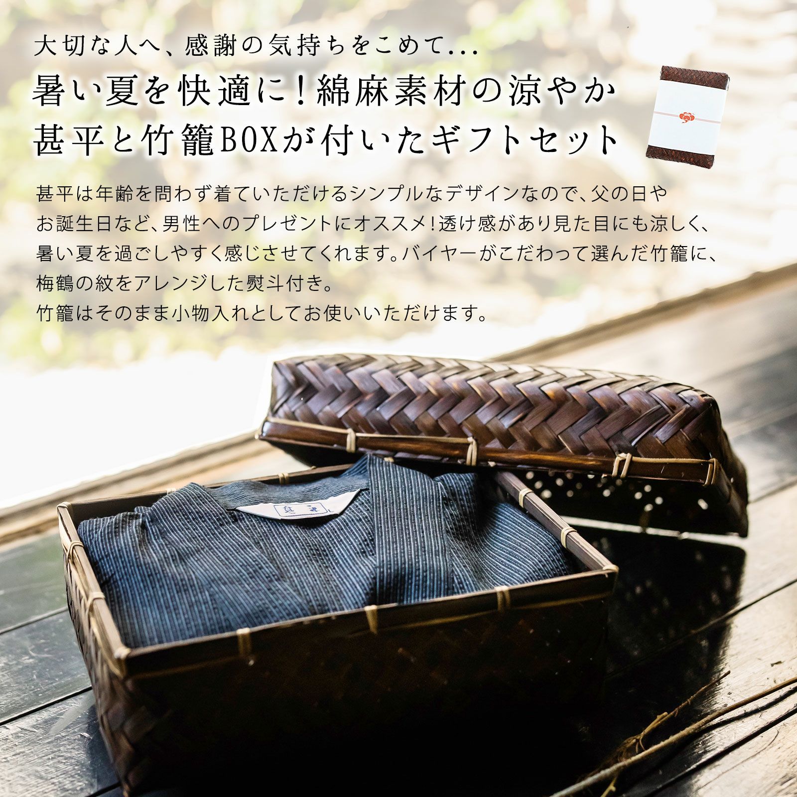 【商品内容】甚平1点(上着とズボンのセット)、竹籠入り・梅熨斗ラッピング付き