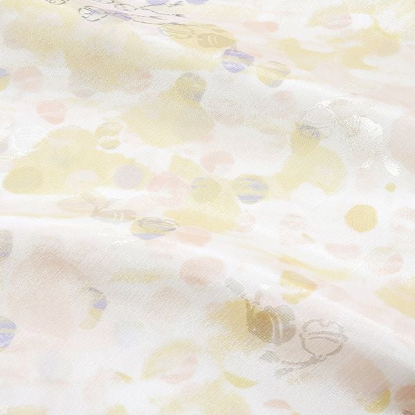 【カラー】鈴の地紋の入った白っぽい地にベージュ、ピンク色の水彩画タッチのマーブル模様に、鈴模様。