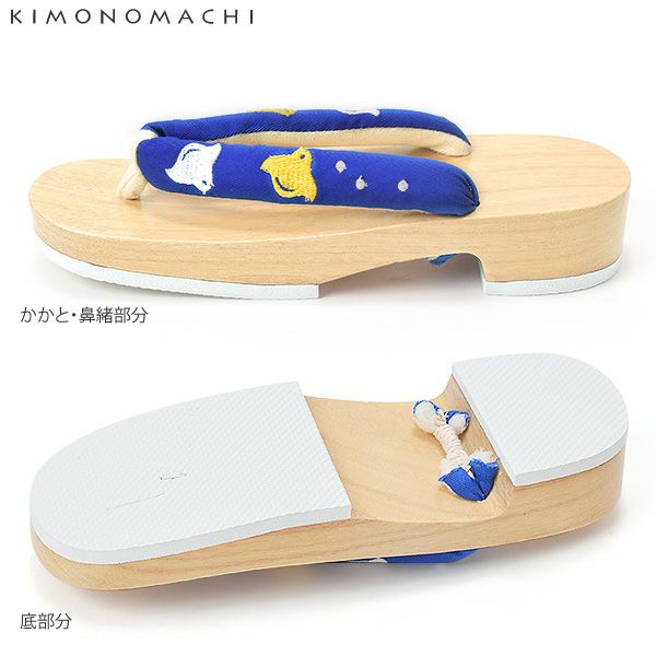 【カラー】ナチュラルなベージュ系の台に、鮮やかな青色の布製の鼻緒。鼻緒には、コントラストもはっきりと、黄色と白色の千鳥の刺繍が足元のワンポイントに。