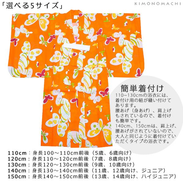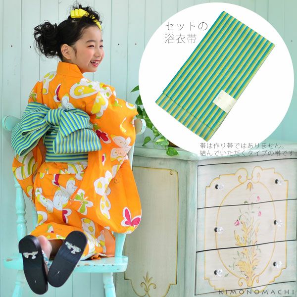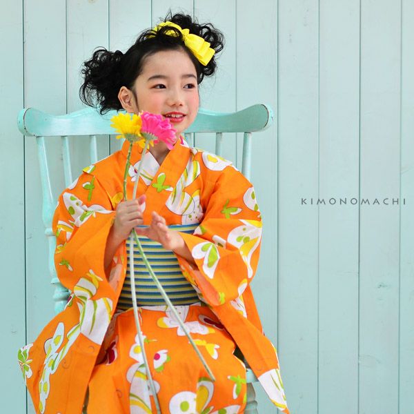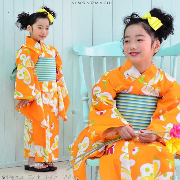 浴衣セット レトロモダン kimonomachi オリジナル 子供浴衣セット ゆかた こども浴衣セット「オレンジ蝶々」110、120、130、140、150 ゆかた 子ども浴衣セット レトロモダン 子供浴衣セット 【メール便不可】ss2206ykl10