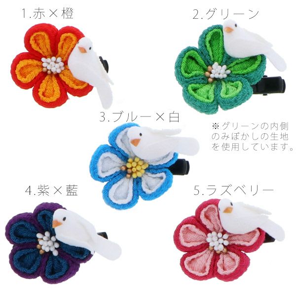 5. 【Prices down3】つまみのお花と鳥髪飾り「赤×橙、グリーン、ブルー×白、紫×藍、ラズベリー」京都きもの町オリジナル つまみ細工髪飾り 七五三 振袖 ポイント髪飾り 【メール便不可】ss2509kkd15