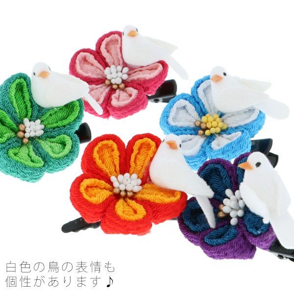 普段使いにも ポイント髪飾りにも つまみクリップ髪飾り 【Prices down3】つまみのお花と鳥髪飾り「赤×橙、グリーン、ブルー×白、紫×藍、ラズベリー」京都きもの町オリジナル つまみ細工髪飾り 七五三 振袖 ポイント髪飾り 【メール便不可】ss2509kkd15