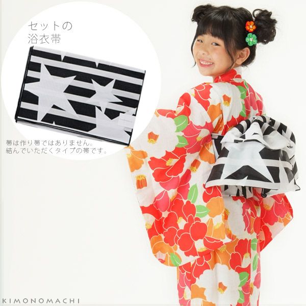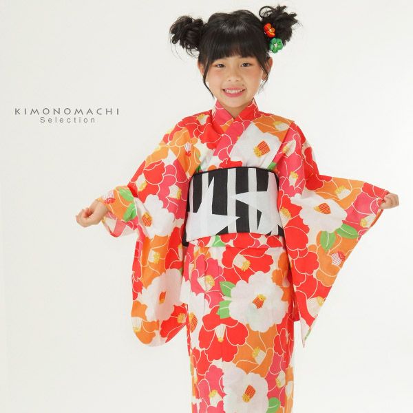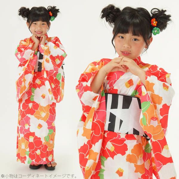 3. こども浴衣セット「赤×オレンジ 椿」110、120、130、140、150 ゆかた 子ども浴衣セット レトロモダン 子供浴衣セット 【メール便不可】ss2206kkd15