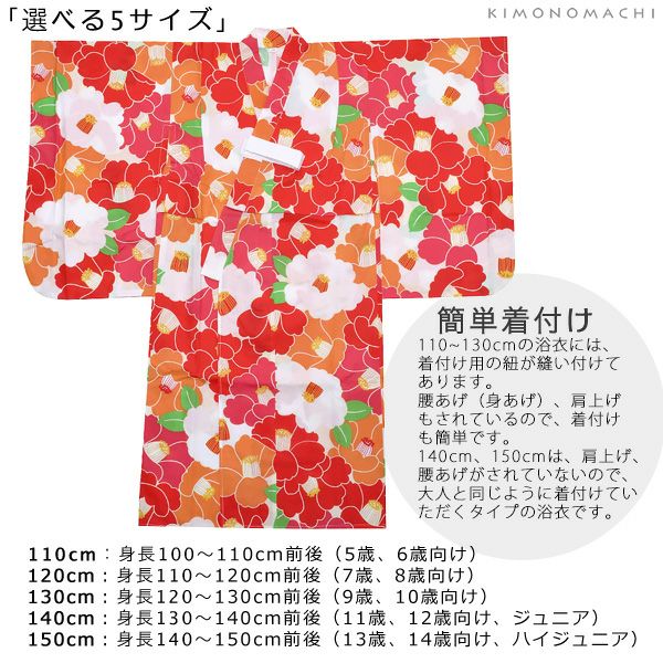 5. こども浴衣セット「赤×オレンジ 椿」110、120、130、140、150 ゆかた 子ども浴衣セット レトロモダン 子供浴衣セット 【メール便不可】ss2206kkd15