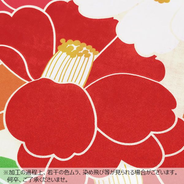 【カラー】ごくごく淡いクリーム色地に、明るい赤、オレンジ、水色などの色使いの椿のお花が重なりあった模様。