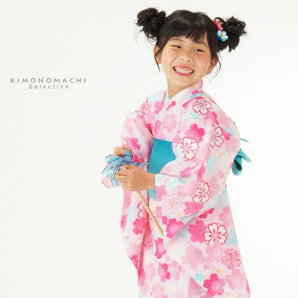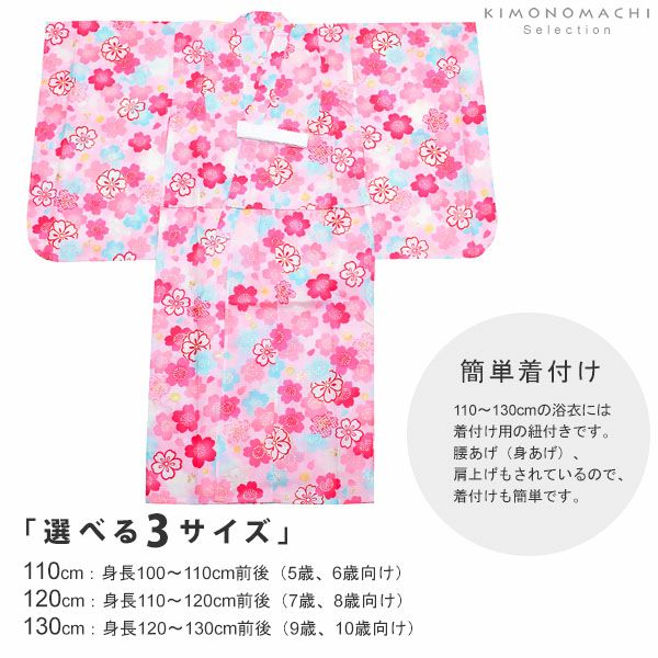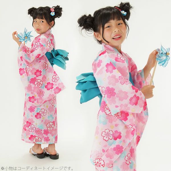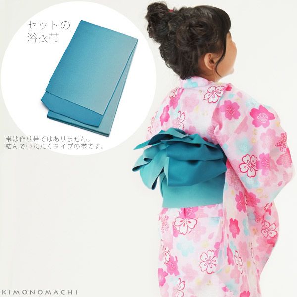 3. こども浴衣セット「ピンク×水色 桜」110、120、130 ゆかた 子ども浴衣セット レトロモダン 子供浴衣セット 【メール便不可】