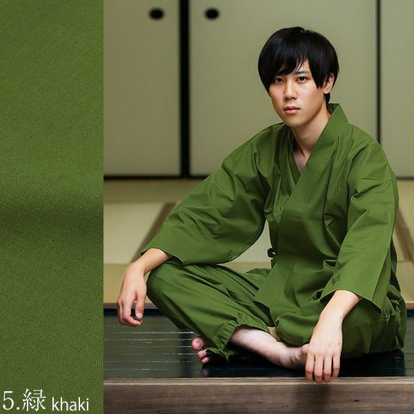 綿ポリ素材の作務衣です。上着、ズボンの上下に分かれています。
