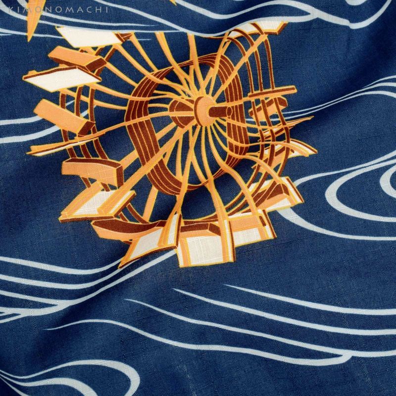 【カラー】濃い青色地に、水色の流水模様。水の流れの合間から、2種の水車と笹の葉が見えるのが涼しげ。水車の部分は白色とオレンジベージュに明るい茶色、ラインとところどころにからし色。笹の葉はオレンジベージュ色、一部に緑色がほんのりと。
