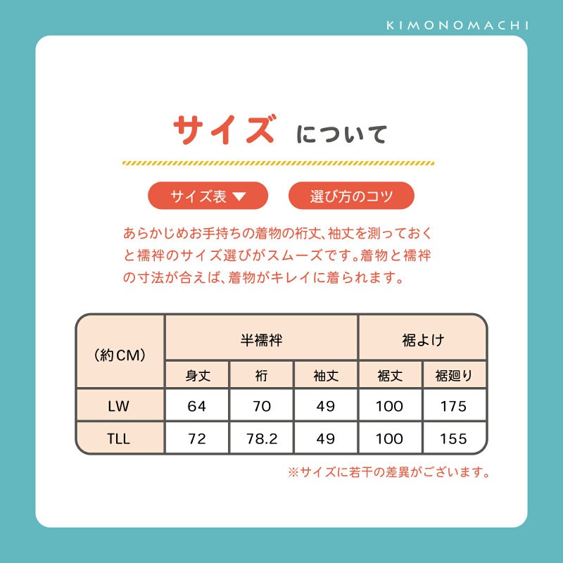白色のシンプルな二部式襦袢です。身長180cm前後までの背が高い方向けのTLL、ヒップ約130cm前後までの方向けのLWの2サイズです。
