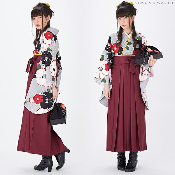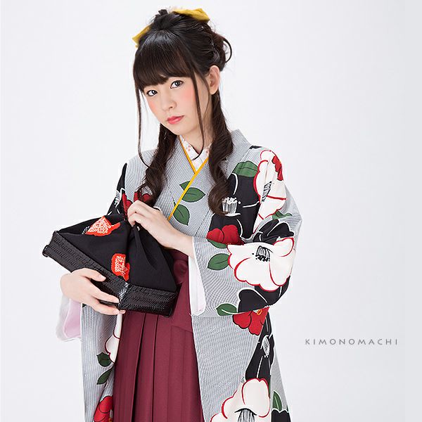 【カラー】着物は、紗綾形に花模様の地紋の入った黒×生成りみの白のストライプ地に、黒、赤、生成りみの白色の椿のお花模様。袴は、紫みを含んだ暗めの濃いエンジ色。