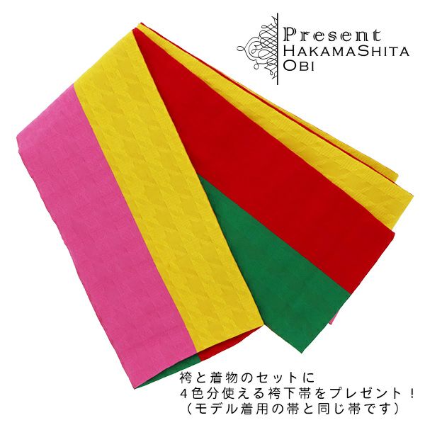 二尺袖着物、袴の2点に、プラス袴下帯がついた計3点セットでお届けします。着物はポリエステル素材ですので、お洗濯も簡単で、お手入れが楽ちんです。袴下帯は、リバーシブルで両面と、上下で色が違うので、どの色を出すかで雰囲気が変わり、1本で4通り使える帯です。モデル通りのコーデもできますし、髪飾りや重ね衿に合わせて、お好みのコーデにも。
