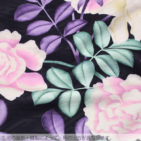 【カラー】着物は、黒色地に紫色、イエローベージュの薔薇模様。襦袢はごく淡いピンク色。