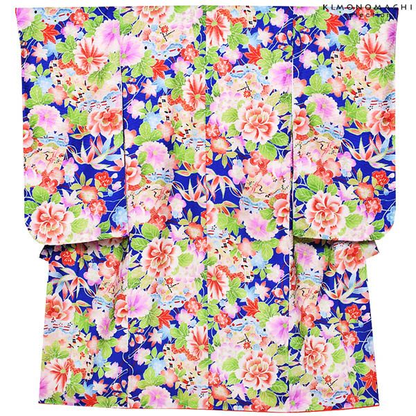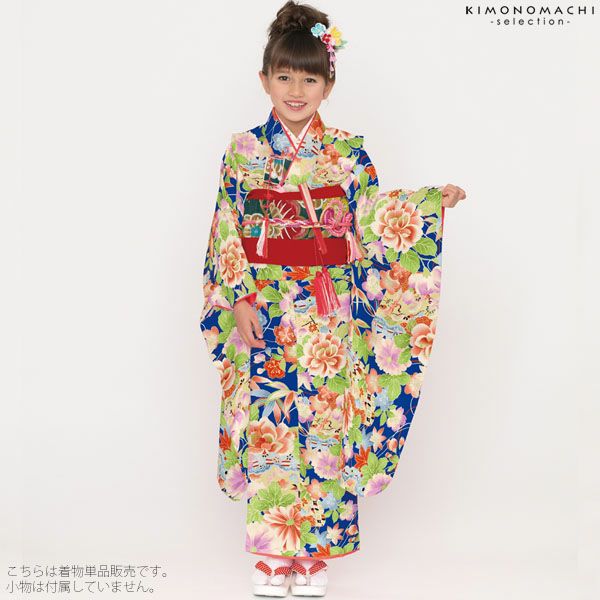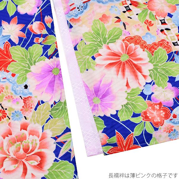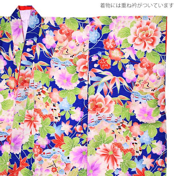 七歳の七五三のお着物(四つ身着物)と長襦袢のセットです。お着物には、重ね衿が縫い付けられています。女の子らしい可愛らしく華やかな色合い。ポリエステル素材ですが、高級感あります。衿元も重ね衿がついているので華やかです。