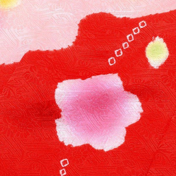 【カラー】淡いピンク地に赤色の染め分け。絞りのお花模様。