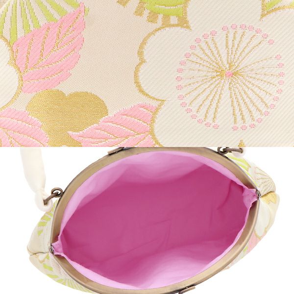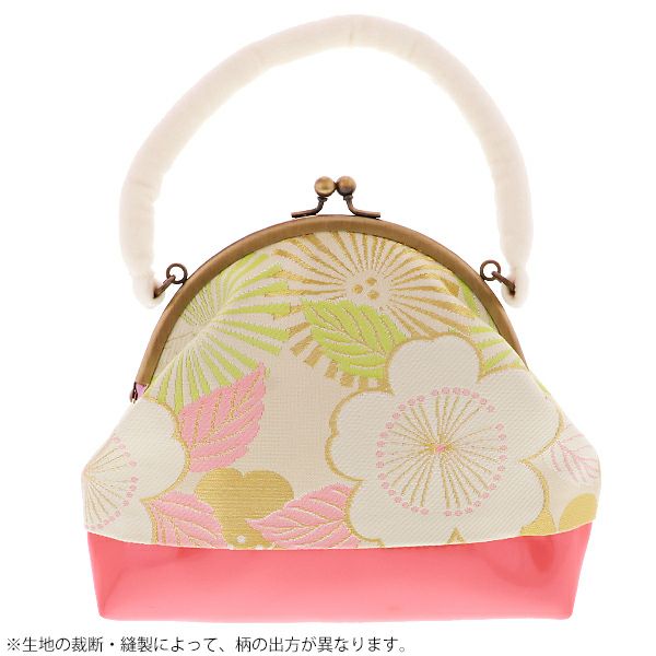 【カラー】バッグの表裏、草履の鼻緒、巻き部分は、生成りみの白色地に桜、松葉模様。バッグの下部、草履の天部分はピンク色。バッグ持ち手、草履の鼻緒の受け部分は柔らかな白色。