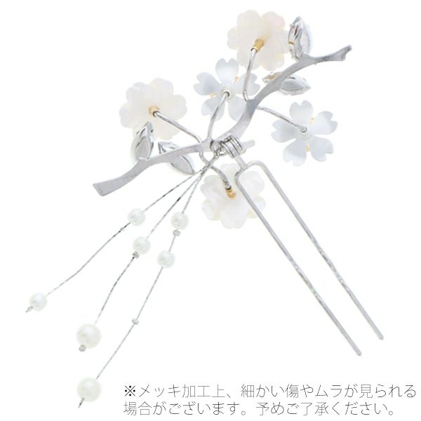 【カラー】全体はシルバー。柔らかな白色系、マットなシルバーの桜。パールビーズのついた下がり飾り。
