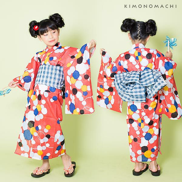 こども浴衣2点セット「ピンク 水玉」110cm、120cm、130cm、140cm、150cm 女の子浴衣セット 夏祭り、花火大会に レトロ KIMONOMACHI