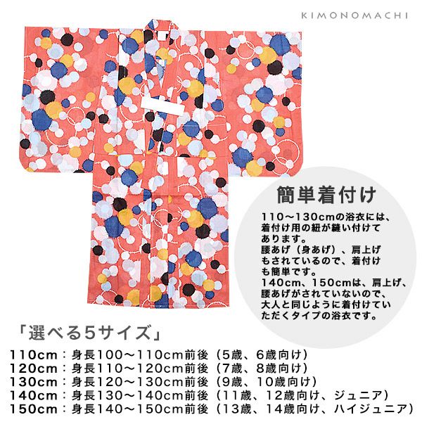 5. こども浴衣2点セット「ピンク 水玉」110cm、120cm、130cm、140cm、150cm 女の子浴衣セット 夏祭り、花火大会に レトロ KIMONOMACHI 【メール便不可】ss2206kkd15
