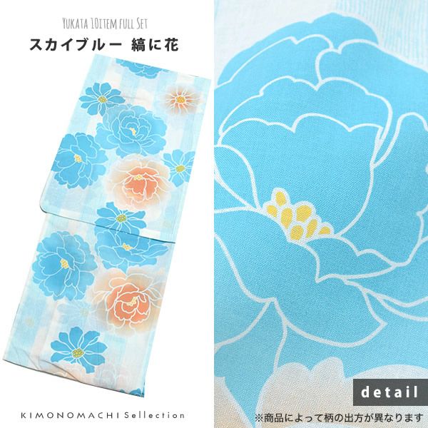 【商品内容】浴衣、浴衣帯、着付け小物セット(浴衣スリップ・浴衣用帯板・伊達締め・腰紐2本)、下駄、籠巾着、浴衣飾り(お花髪飾り)の計10点