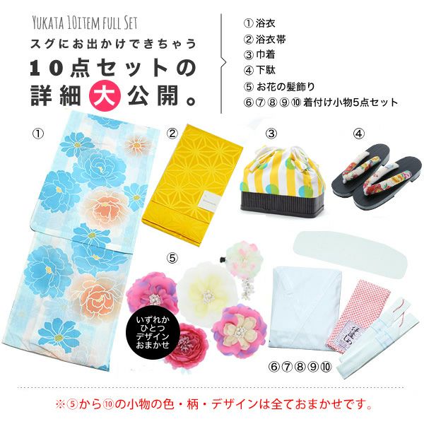 画像の浴衣、帯、下駄、巾着、浴衣スリップ、帯板、伊達締め、腰紐(2本)、浴衣飾り(お花飾り)の10点セットです。