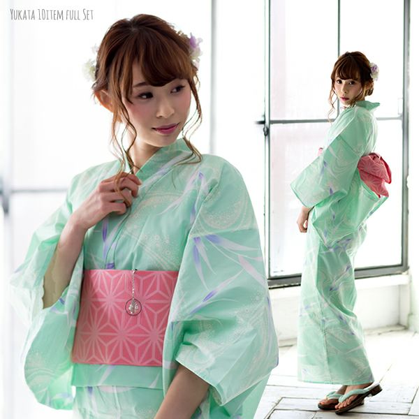 フリーサイズの女性浴衣、浴衣帯、下駄、籠巾着、浴衣着付けセット、浴衣飾りが付いた激安豪華10点セットです!!