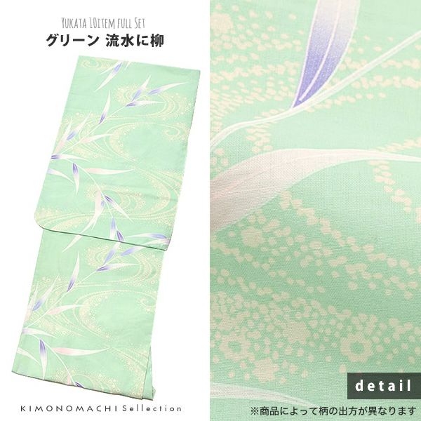 【カラー】浴衣は淡い柔らかなグリーン色地に、天の川のような流水に柳模様。帯はコーラルピンクのような、暖かみのあるピンク。巾着はグリーン系の色使いのストライプ模様。竹籠部分は黒塗り。下駄は紫地に大きな花模様。台は黒塗り。