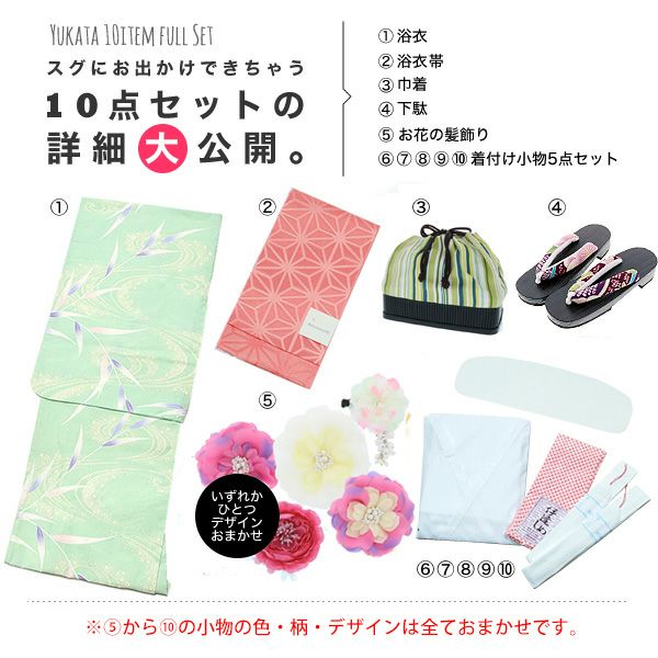 【商品内容】浴衣、浴衣帯、着付け小物セット(浴衣スリップ・浴衣用帯板・伊達締め・腰紐2本)、下駄、籠巾着、浴衣飾り(お花髪飾り)の計10点