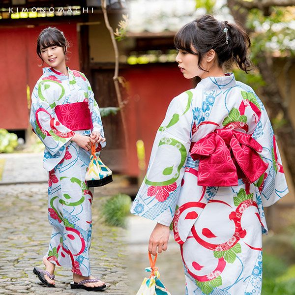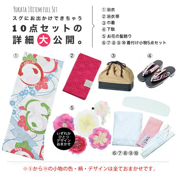 【商品内容】浴衣、浴衣帯、着付け小物セット(浴衣スリップ・浴衣用帯板・伊達締め・腰紐2本)、下駄、籠巾着、浴衣飾り(お花髪飾り)の計10点