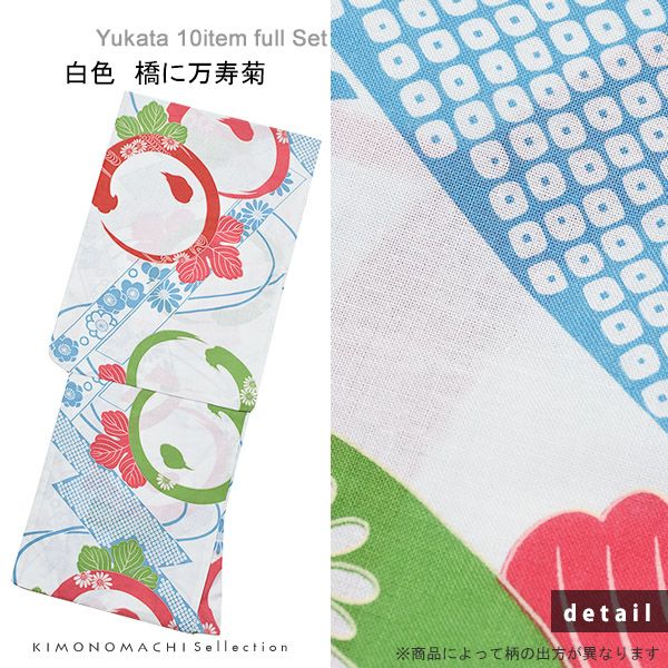 画像の浴衣、帯、下駄、巾着、浴衣スリップ、帯板、伊達締め、腰紐(2本)、浴衣飾り(お花飾り)の10点セットです。