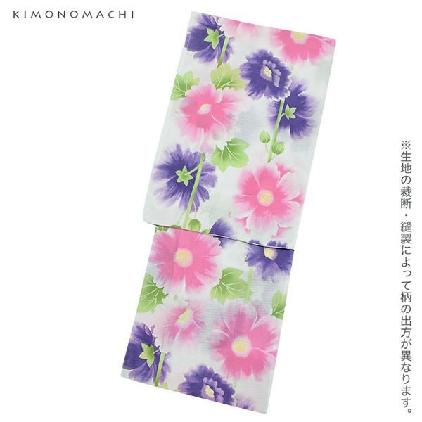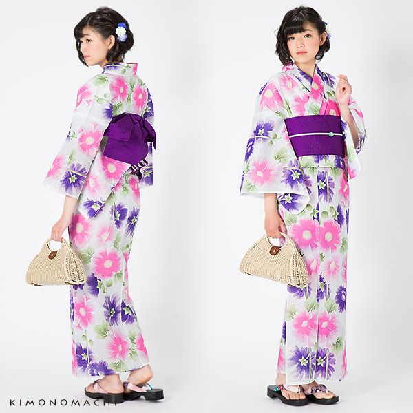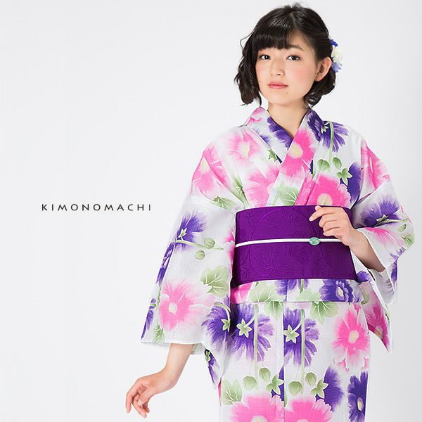 【カラー】浴衣は、白地に、ピンク色とやや灰色がかった青色のタチアオイのお花模様。帯は、鮮やかな濃い紫色に葡萄蔦模様。