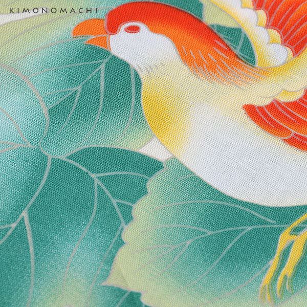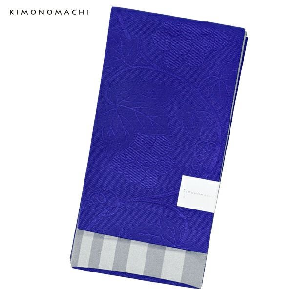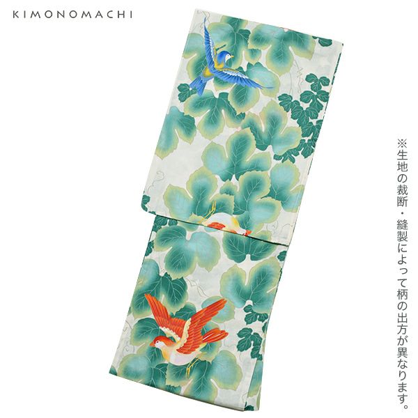 【カラー】浴衣は、ごく薄い生成り色地に、蔦と鳥の柄。帯は、鮮やかな濃い青色に葡萄蔦模様。