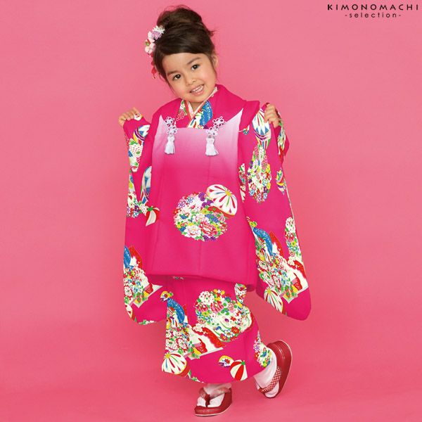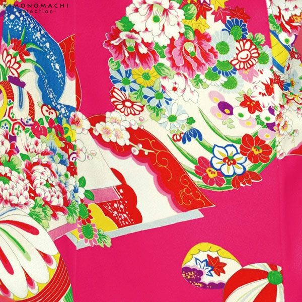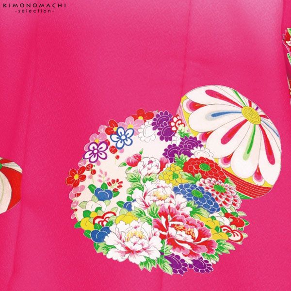 【カラー】被布コートは濃いピンク白ぼかし地に毬、花の丸模様。着物は濃いピンク色地に毬、花の丸模様。