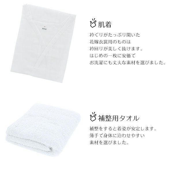肌着:衿ぐりがたっぷり開いた花嫁衣裳用のものは衿回りが美しく抜けます。はじめの一枚に安価でお洗濯にも丈夫な素材を選びました。