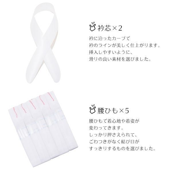 腰ひも×5:腰ひもで着心地や着姿が変わってきます。しっかり押さえられて、ごわつきがなく結び目がすっきりするものを選びました。