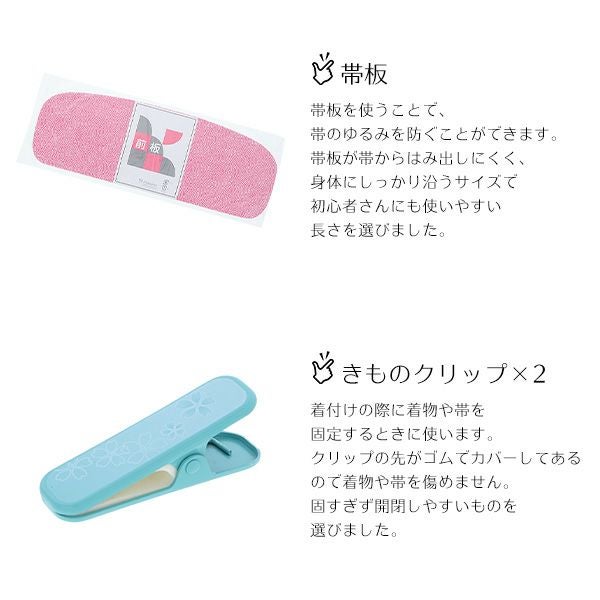 帯板:帯板を使うことで、帯のゆるみを防ぐことができます。帯板が帯からはみ出しにくく、身体にしっかり沿うサイズで初心者さんにも使いやすい長さを選びました。