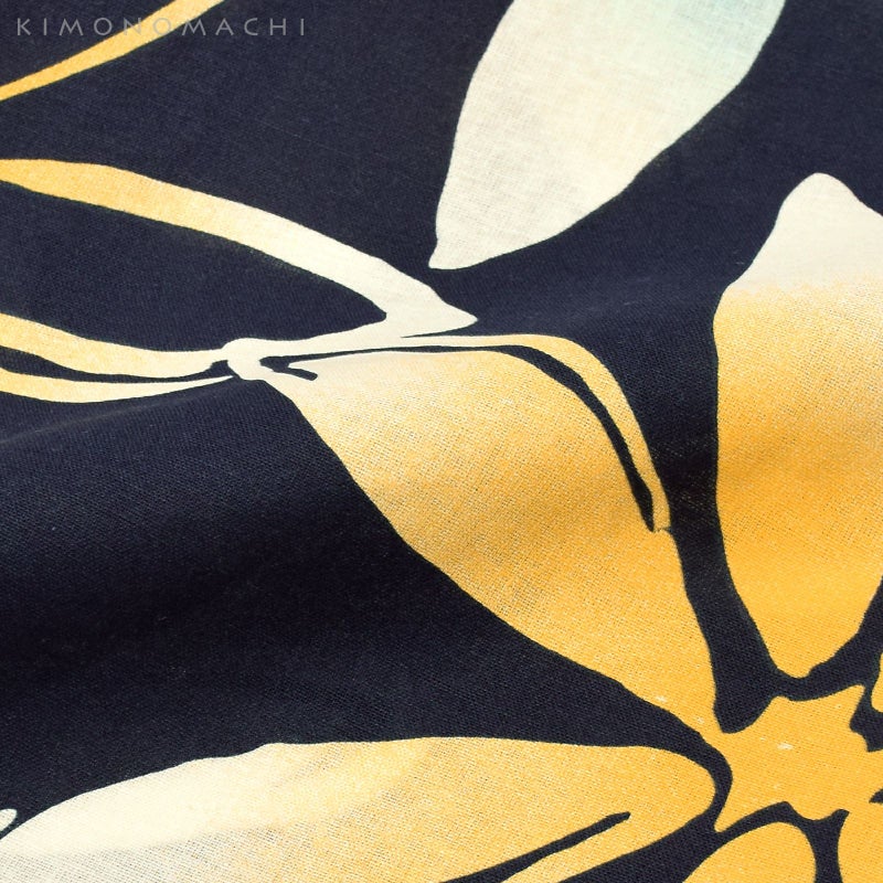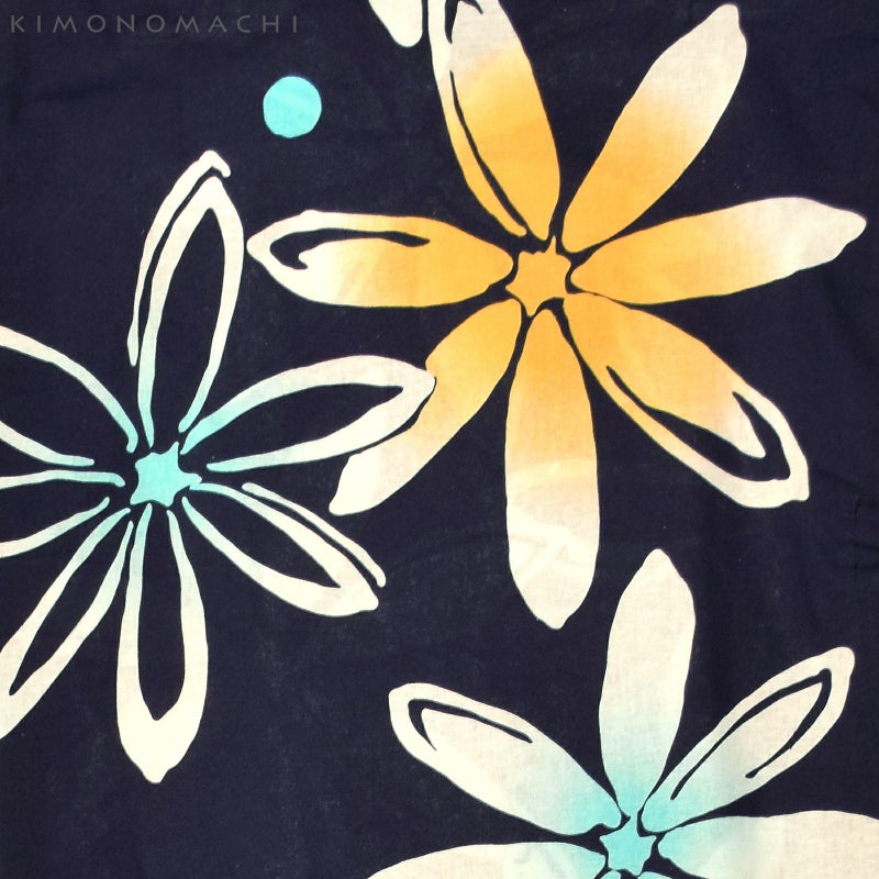 【色柄】深い紺色の地に、ごくごく淡い生成り色の花、花の中央は水色や山吹色のぼかし。花と同色の水玉がシンプルな浴衣を可愛らしい印象に。