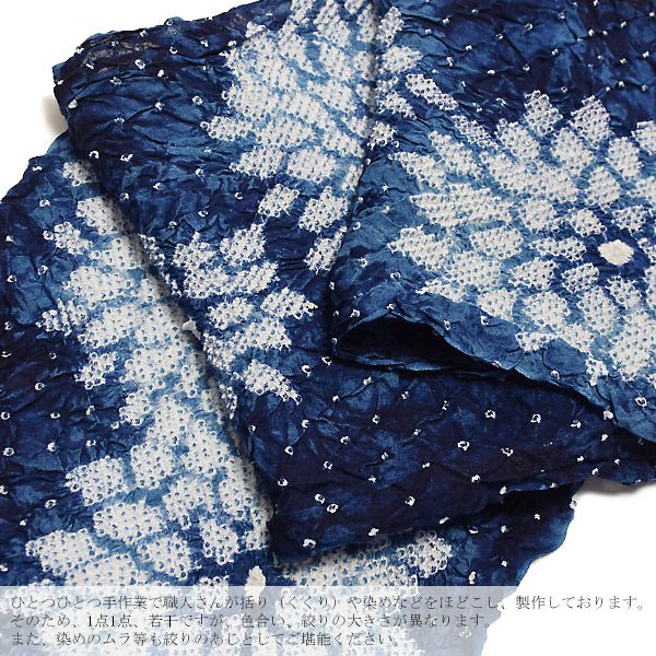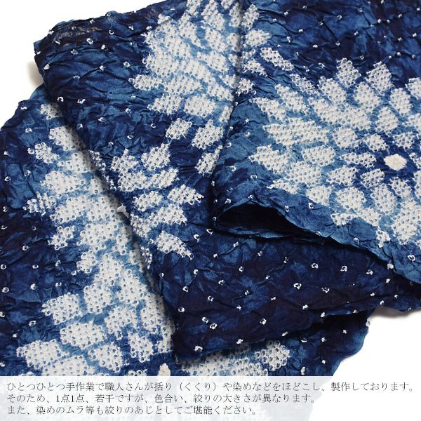 ※ひとつひとつ手作業で職人さんが括り(くくり)や染めなどをほどこし、製作しております。そのため、1点1点、若干ですが、色合い、絞りの大きさが異なります。また、染めのムラ等も絞りのあじとしてご堪能ください。
