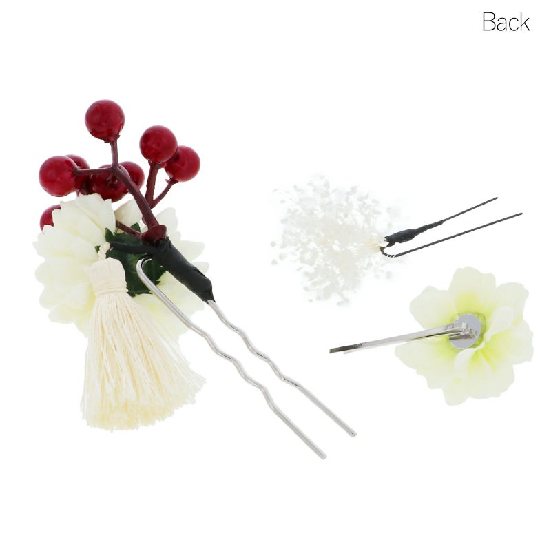 【カラー】オフホワイトのポンポンのようなお花に赤い実、ベージュのタッセルのミニかんざし、細かな白花のUピン、クリーム色のお花のヘアピンの3点セットです。洋風アレンジにも◎