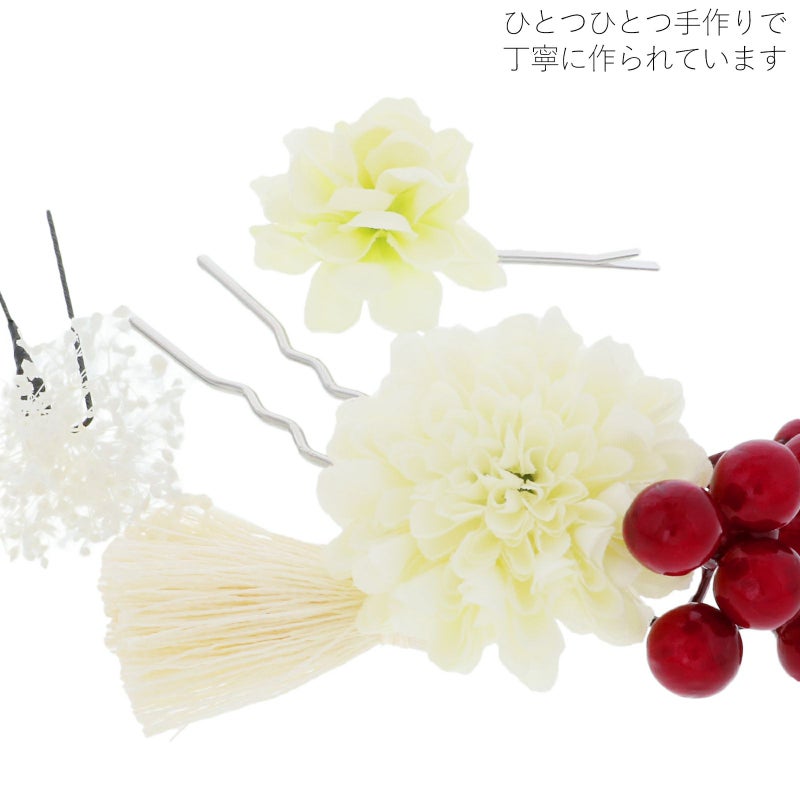ポンポンのようなお花に赤い実とタッセルのミニかんざし、かすみ草の細かな白花のUピン、小花のヘアピンの3点セットです。まとめ髪に挿して、簡単につけていただけます。浴衣にはもちろん、振袖などの華やかなお着物にも。アンティーク風な台紙がついているので、額縁をつけて部屋に飾ってもカワイイ!プレゼントにも最適です。日本製です。