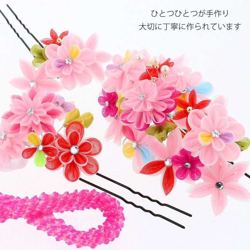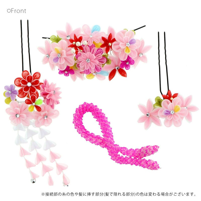 【カラー】オーガンジー風の透け感のあるドレッシーなつまみのかんざしセット。淡いピンクを中心に、赤や水色、紫、黄色、濃ピンクなどのつまみの花飾りにパールビーズ。前挿しは淡いピンク、赤の小花、淡いピンクや濃ピンク、水色、黄色の花に淡いピンクと白のつまみの房。ピンクのちんころ。